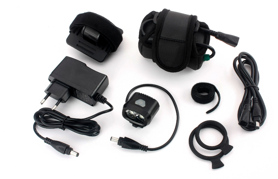 Med sine kun ca. 60 gram er lygten perfekt til at sætte på hjelmen. Samlet vægt inkl. ekstern batteri ca. 350 gram.