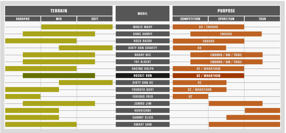 Schwalbes nok mest alsidige XC/Marathon dæk hedder Rocket Ron. Til de danske forhold kan det køres i ca. 9 mdr. om året.